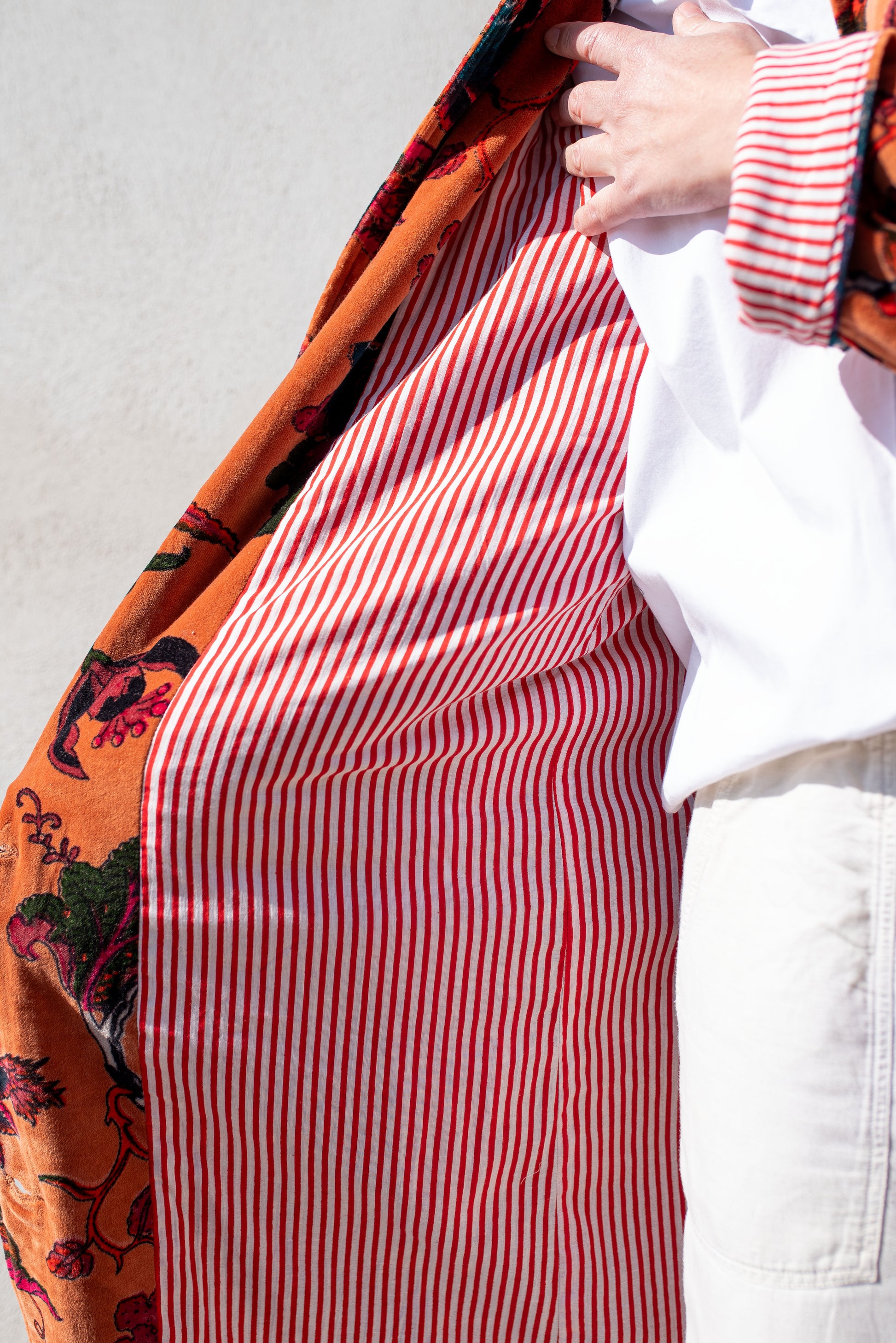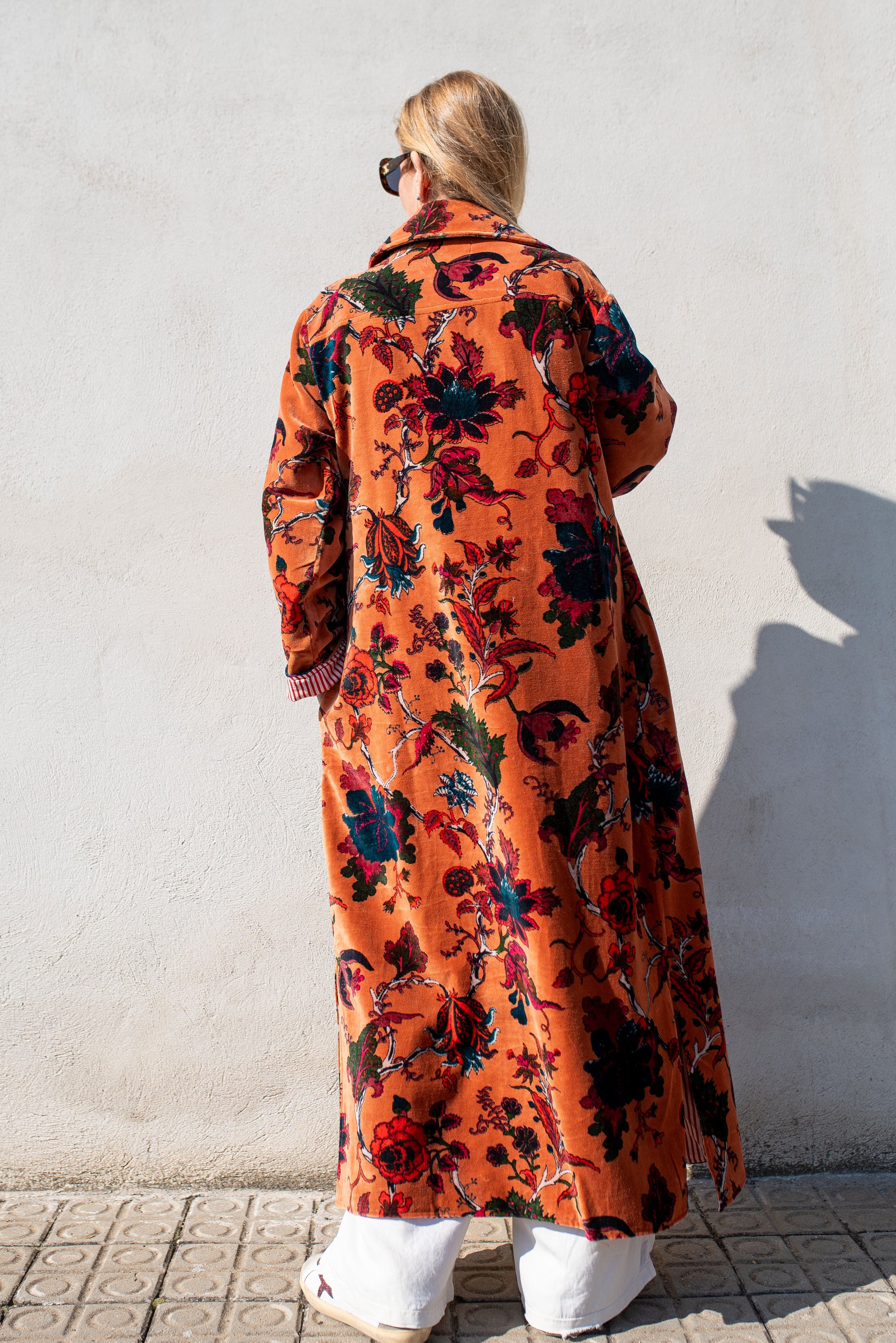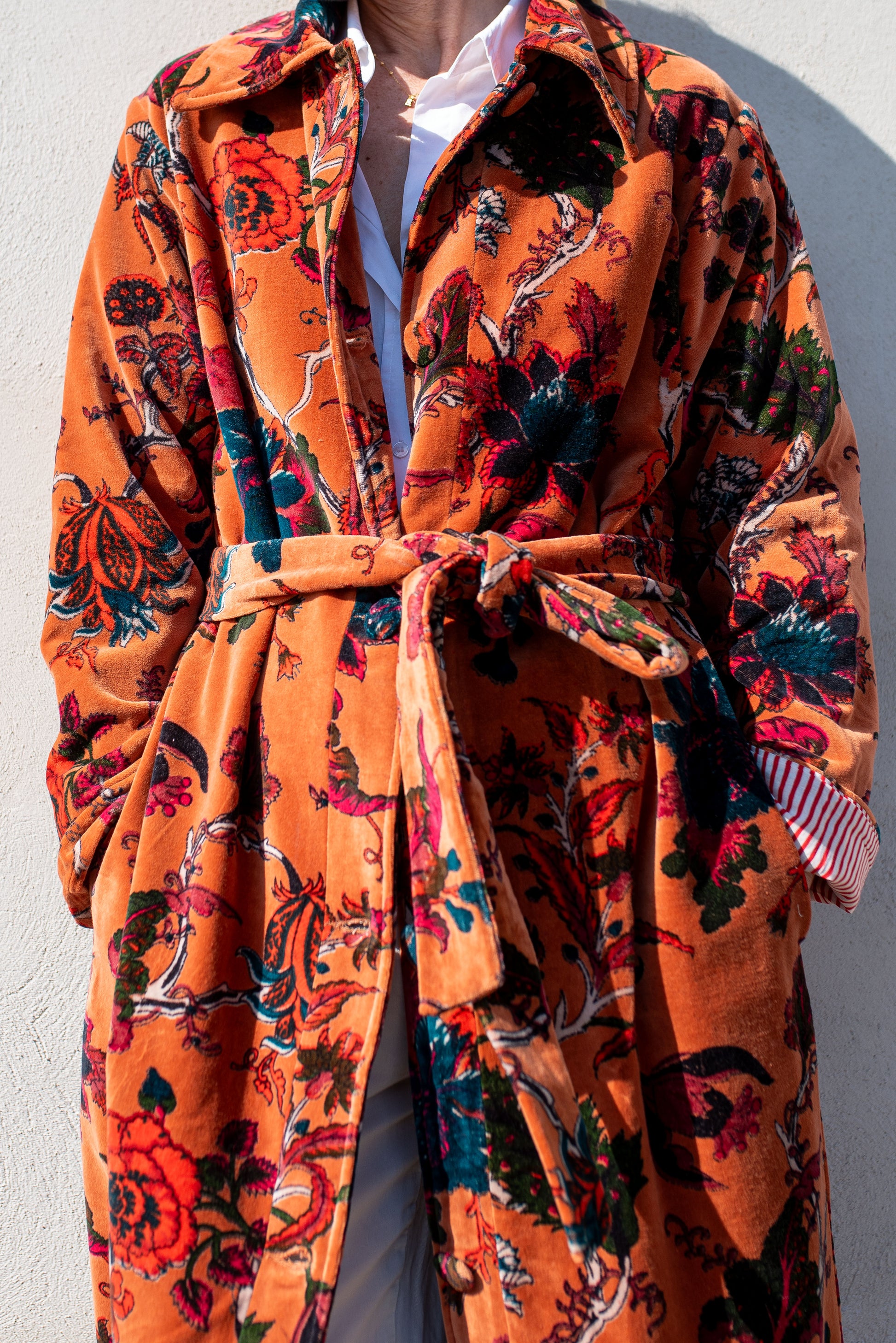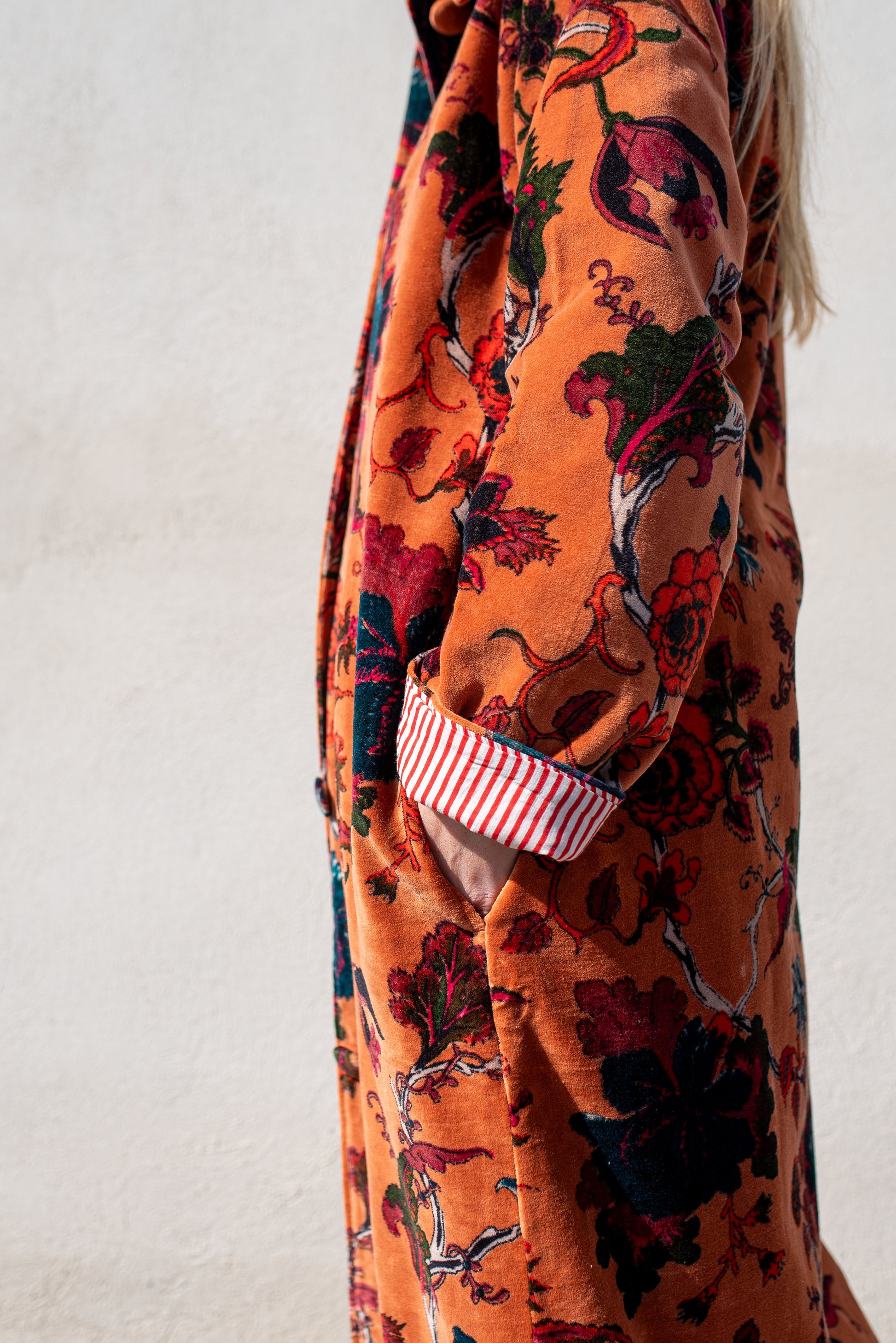 Abrigo de terciopelo con cuello, botones, forro, cinturón y bolsillos. Se puede llevar abierto o cerrado.