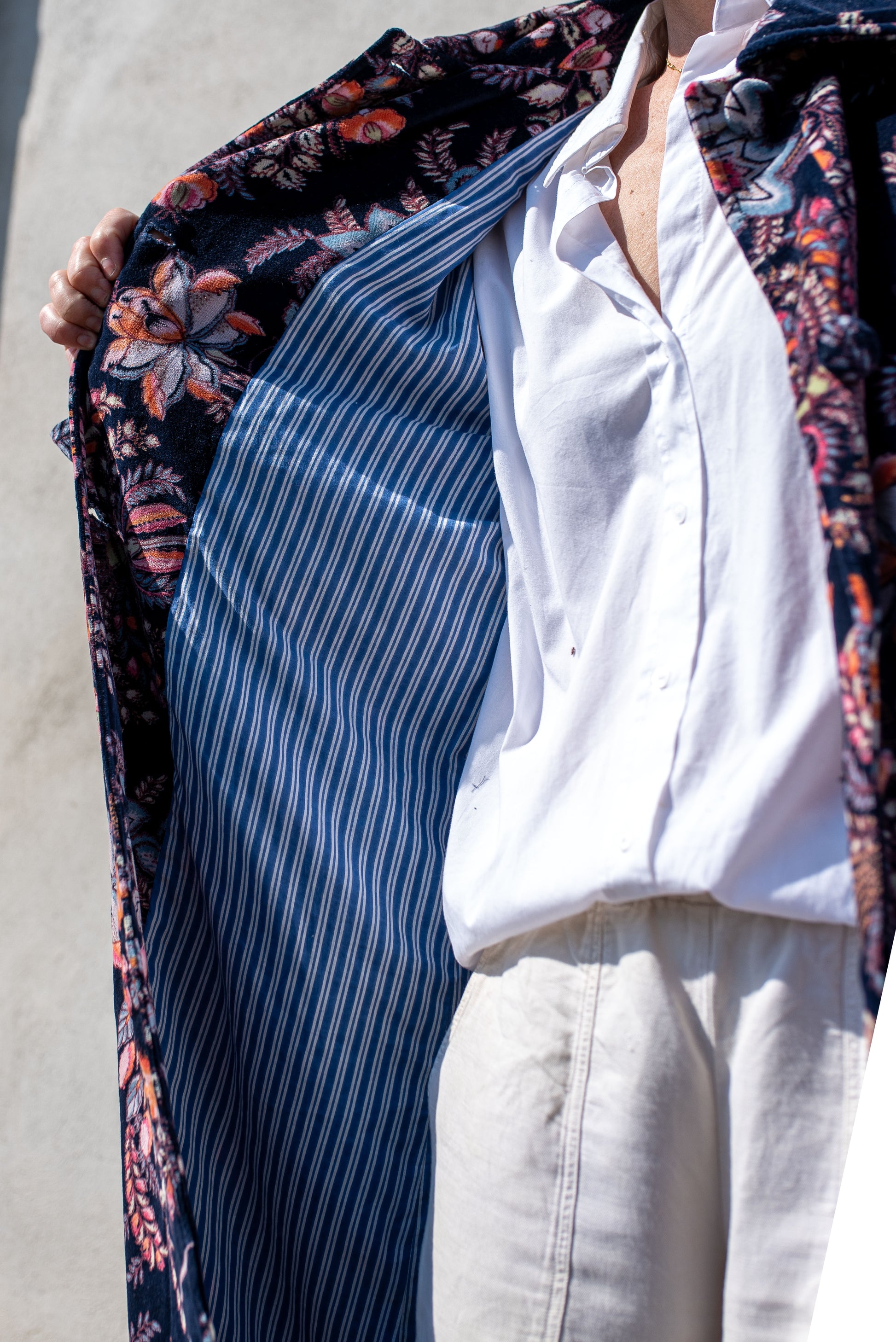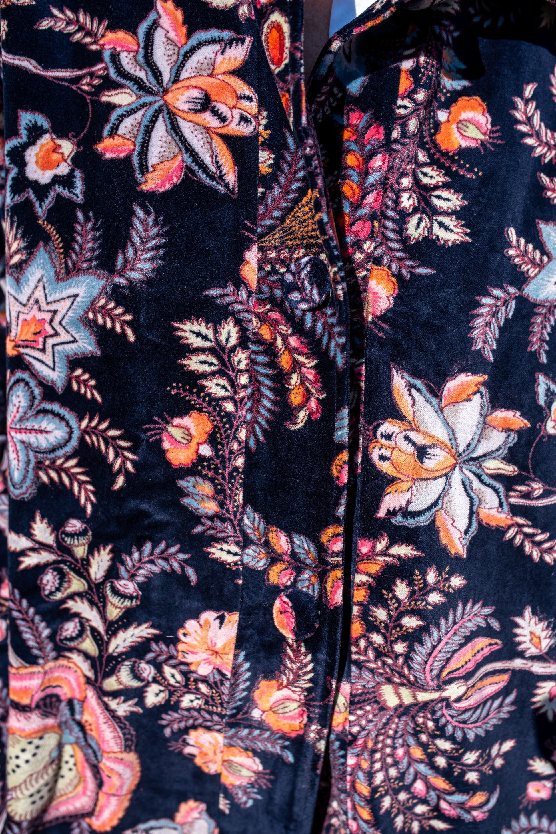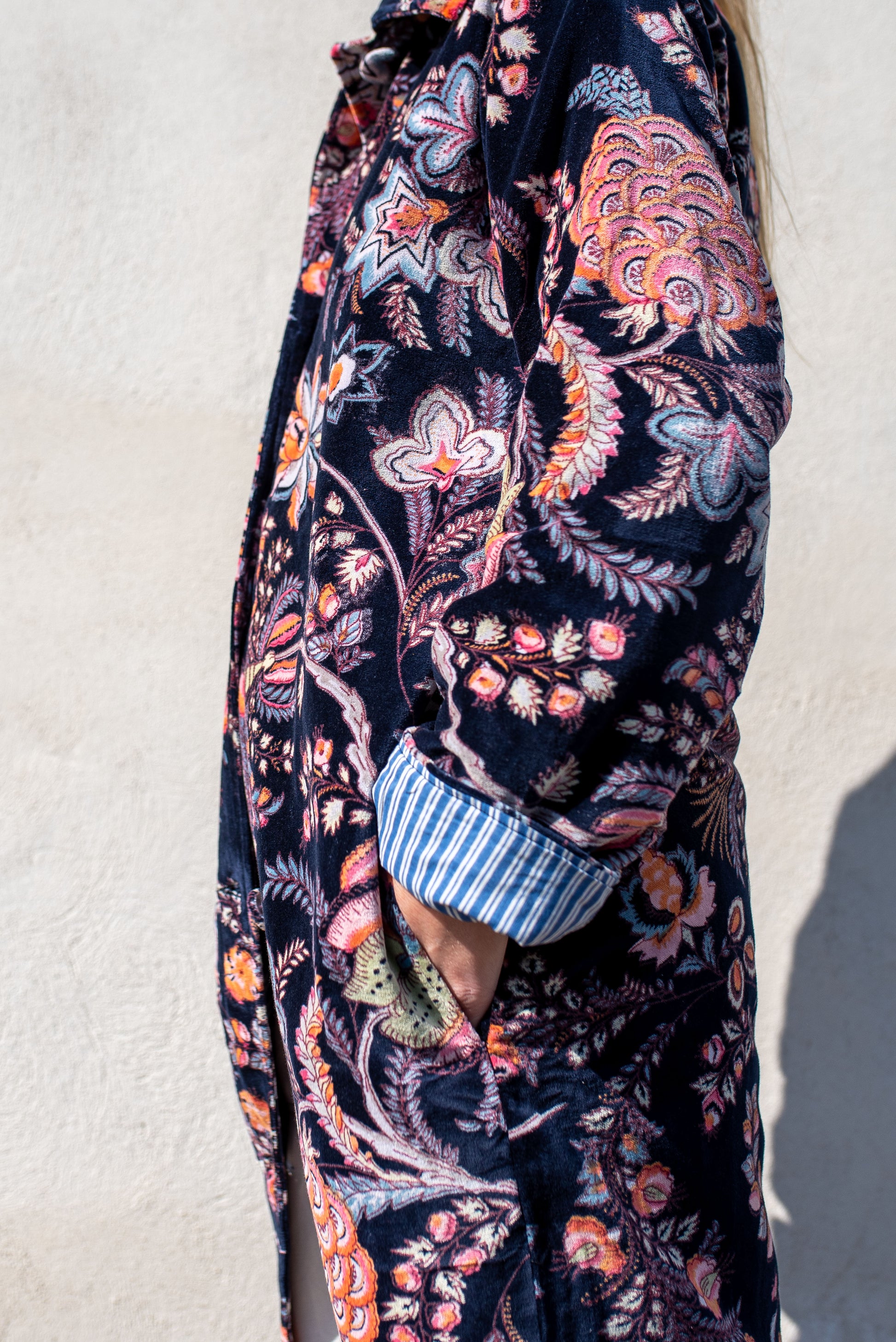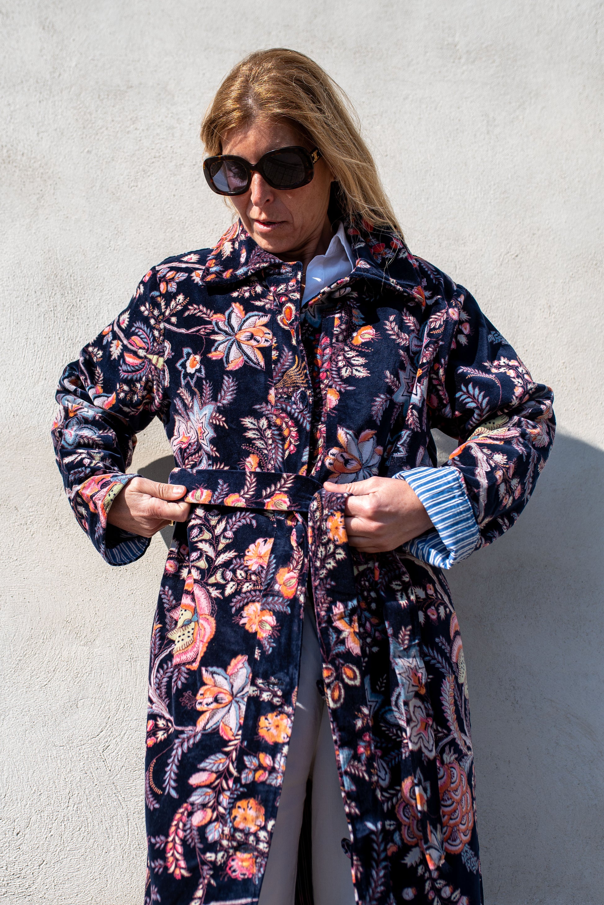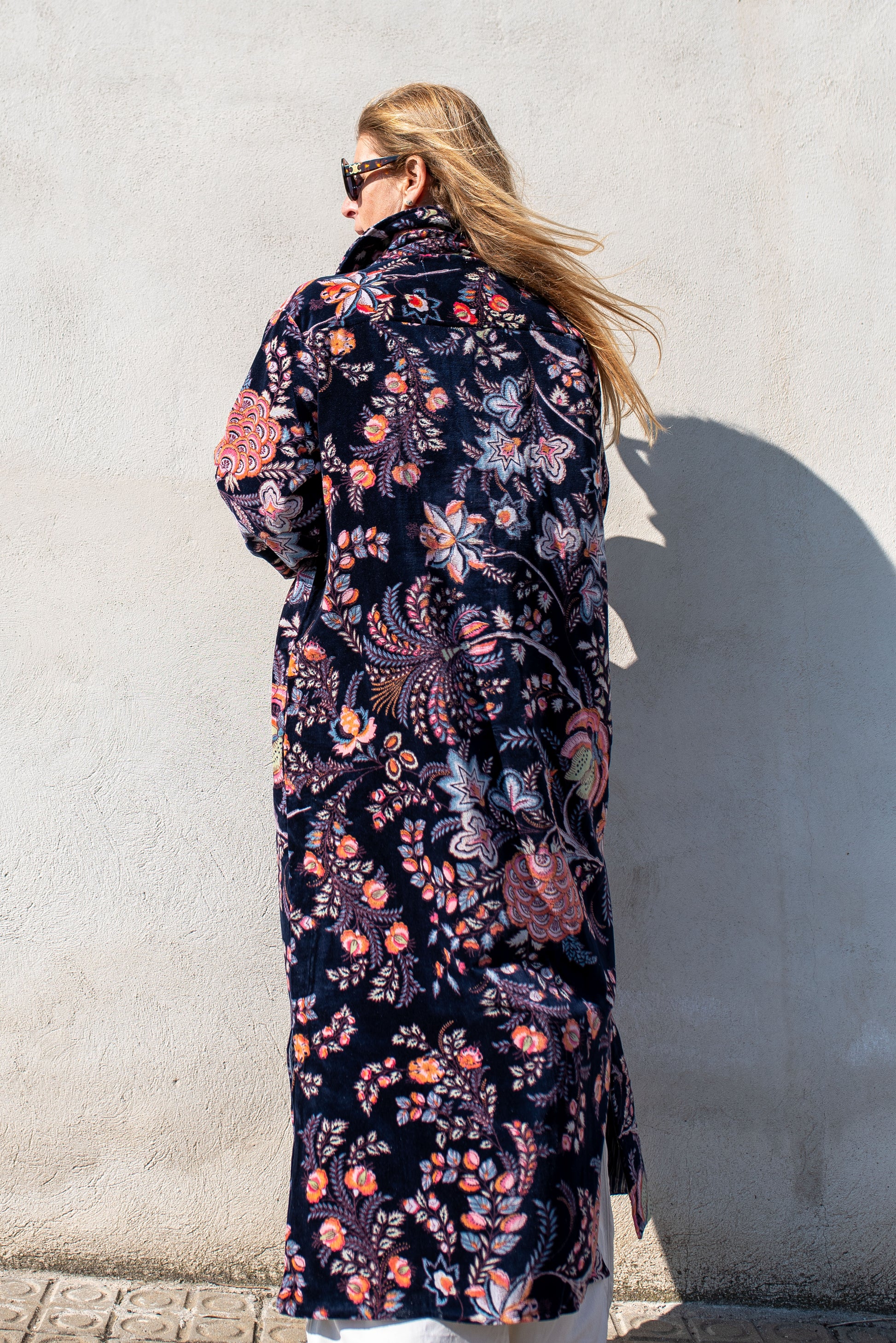 Chaqueta larga de terciopelo de algodón, Bolsillos laterales, forrada con tela de algodón estampada con cinturón.