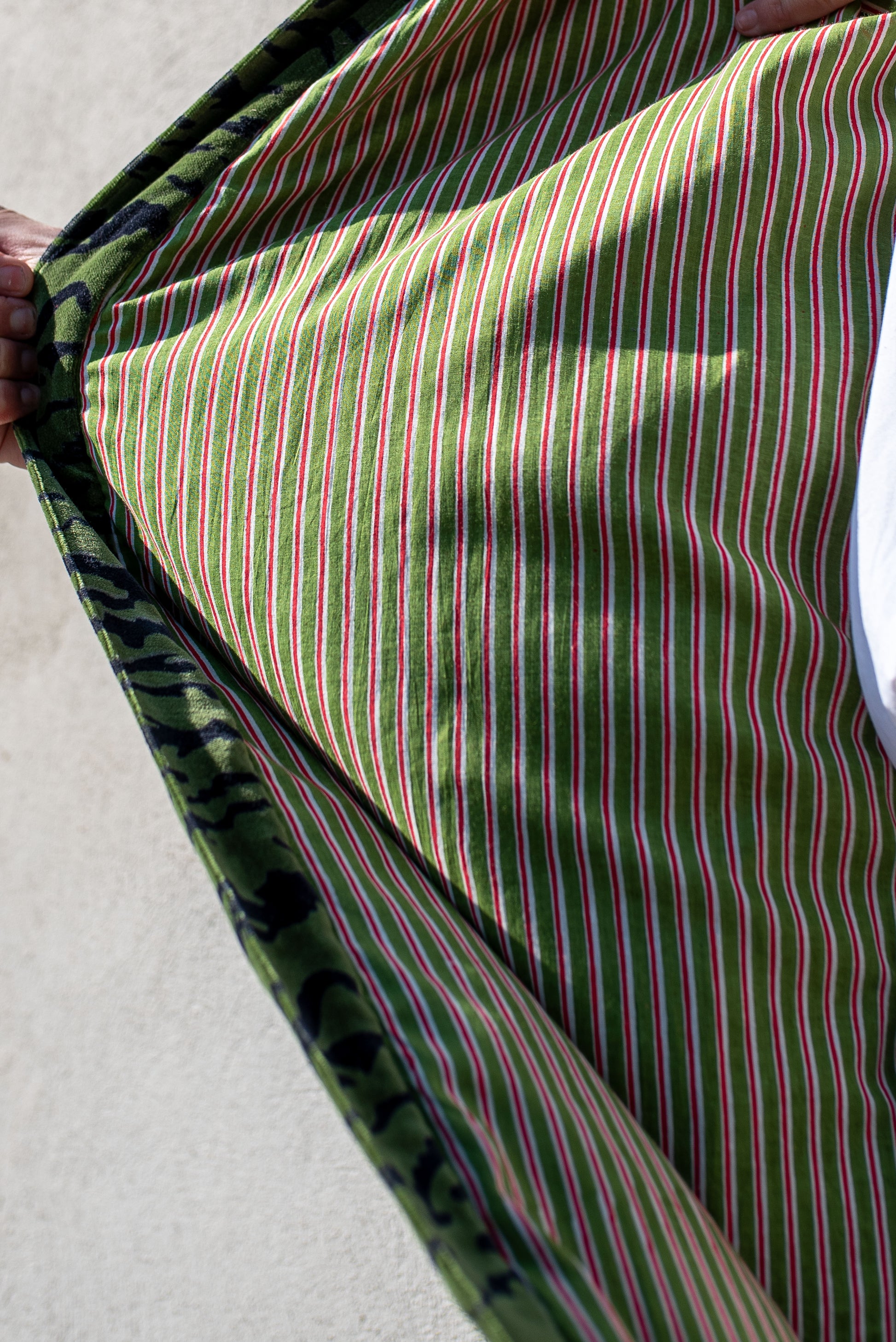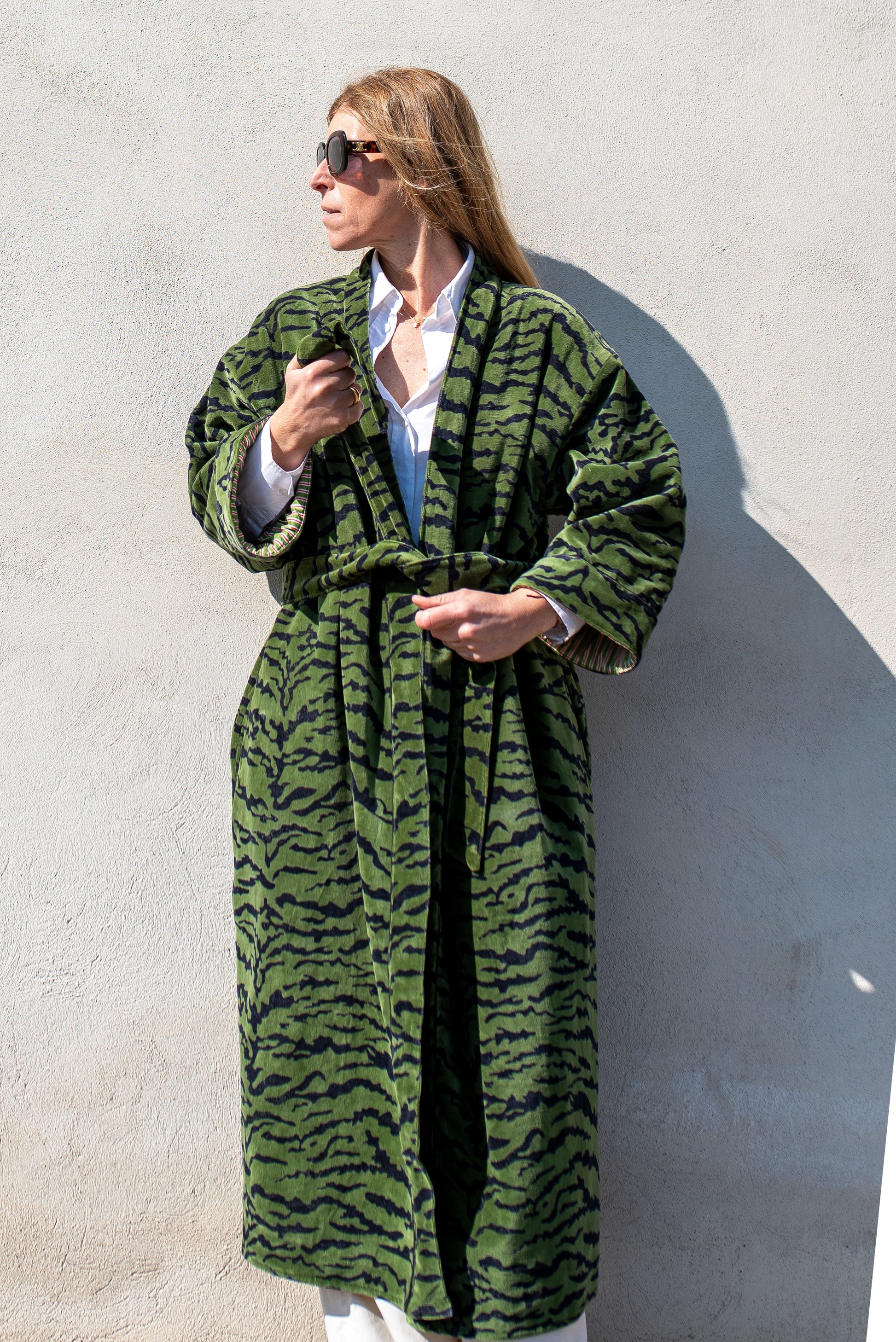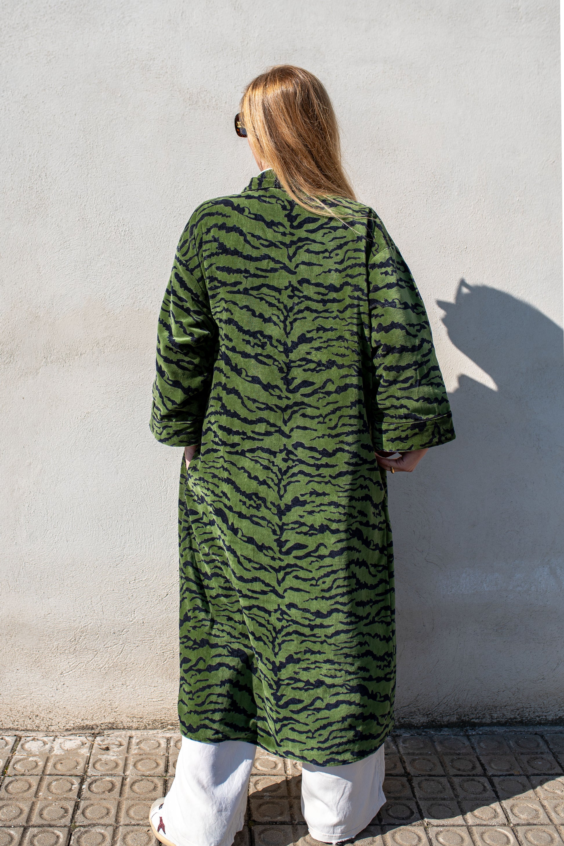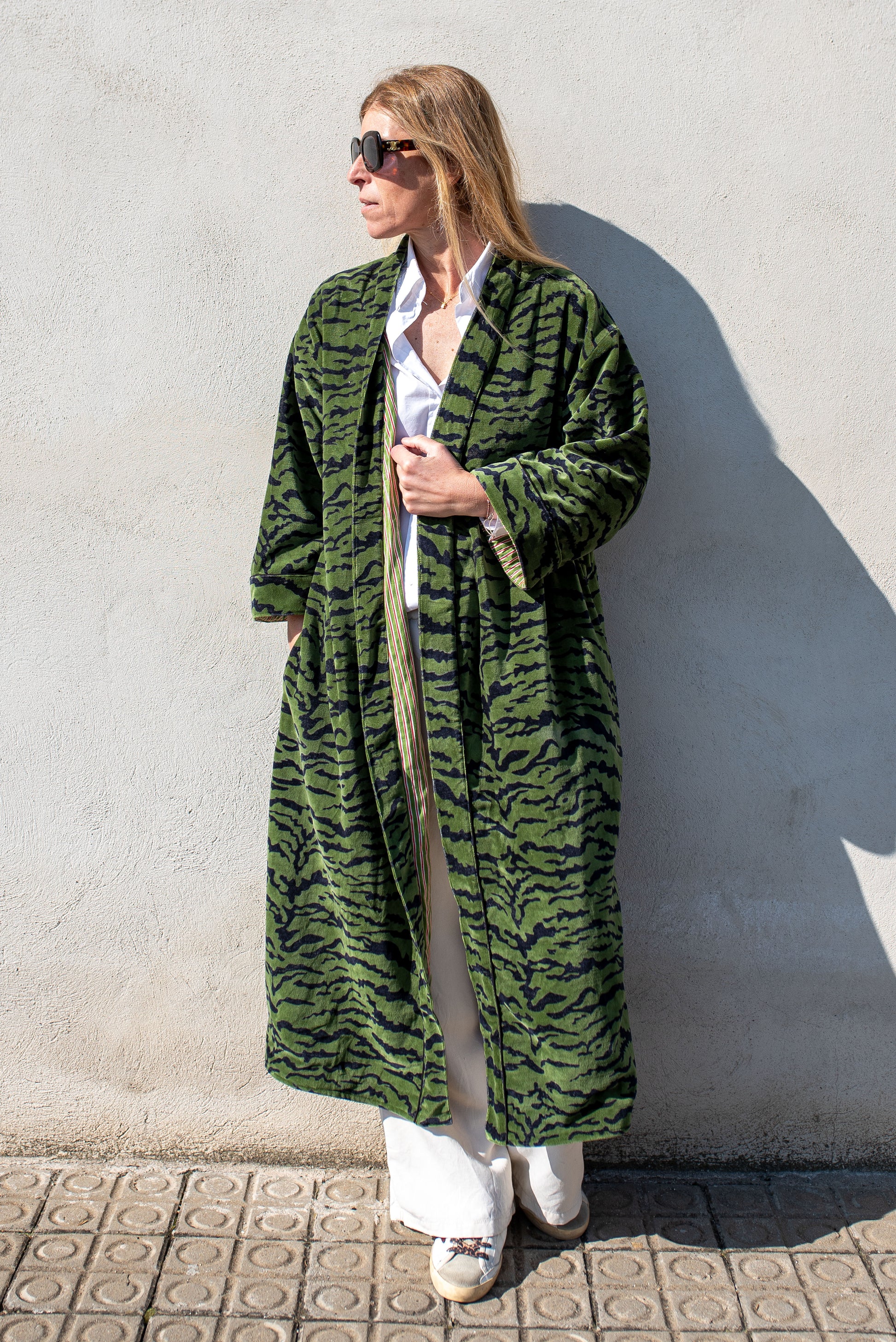 Chaqueta larga de terciopelo de algodón, Bolsillos laterales, forrada con tela de algodón estampada con cinturón.