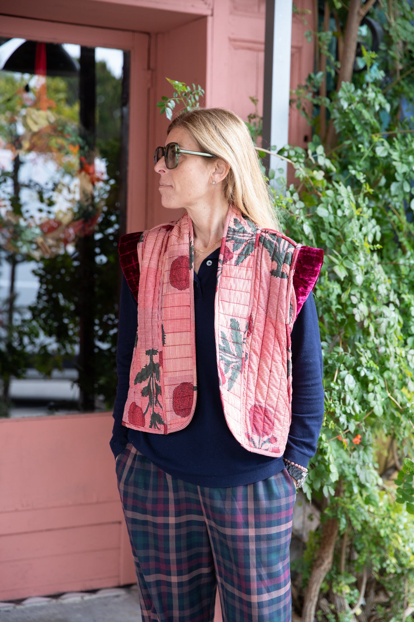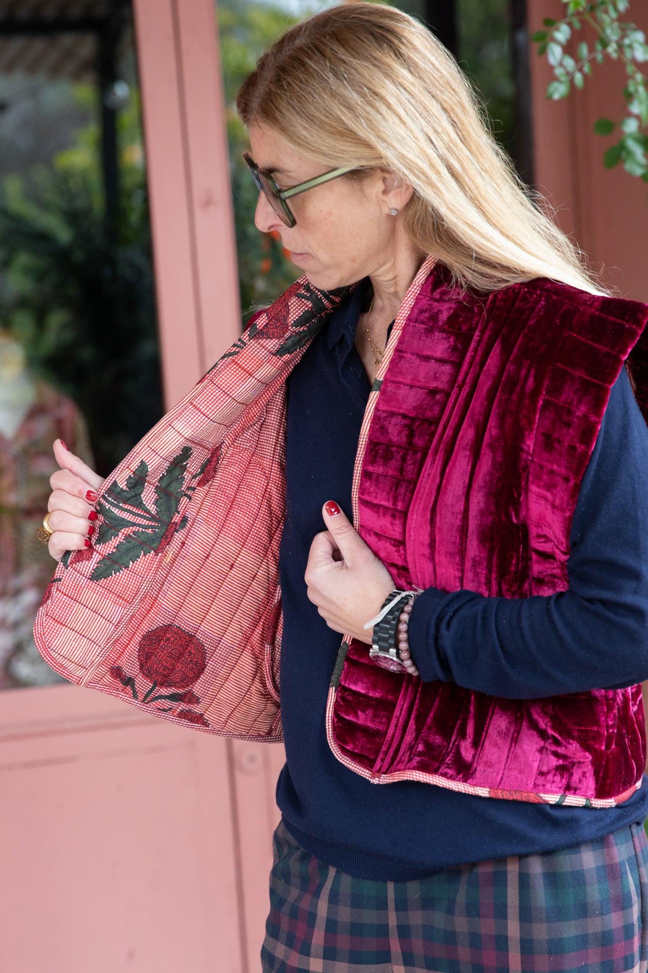 Este chaleco reversible de terciopelo de seda acolchado es la prenda perfecta para quienes buscan estilo y comodidad en una sola pieza. Su forro de algodón estampado añade un contraste único, permitiendo dos looks diferentes en un mismo diseño. Ideal para combinar con camisas, vestidos o prendas de punto.