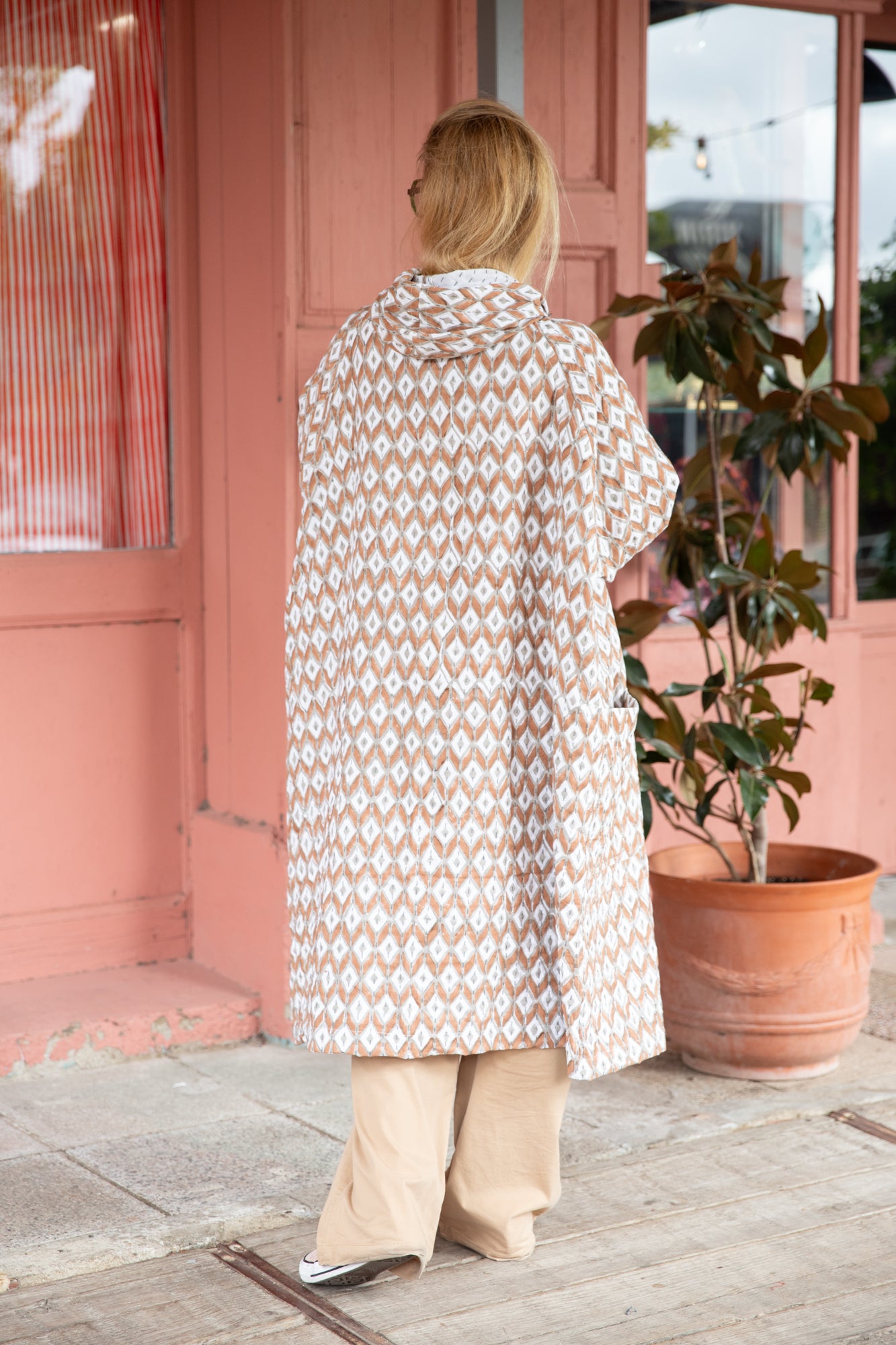 Chaqueta oversize de algodón, prespunteada a mano de arriba a abajo, reflejo de un trabajo artesanal delicado. Su estampado suave aporta elegancia y sutileza, mientras que los bolsillos y la capucha añaden funcionalidad y confort. Lavado a mano en agua fría para preservar la calidad del tejido.