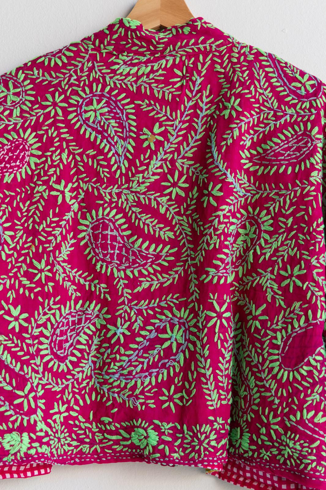 Chaqueta bordada a mano y forrada. Tejido georgette con forro de algodón. Talla única. Lavar a mano con agua fría.