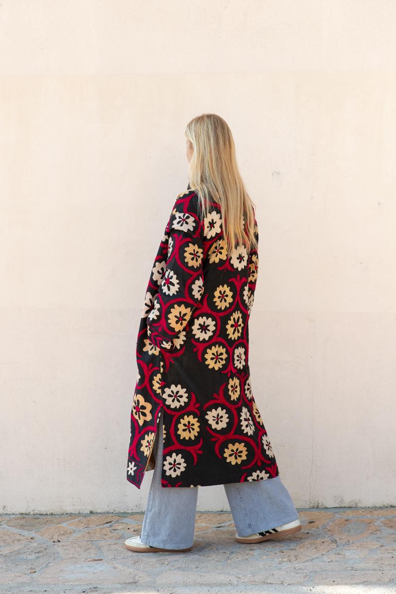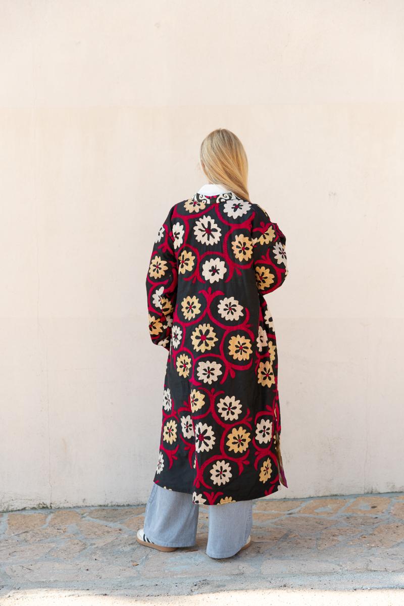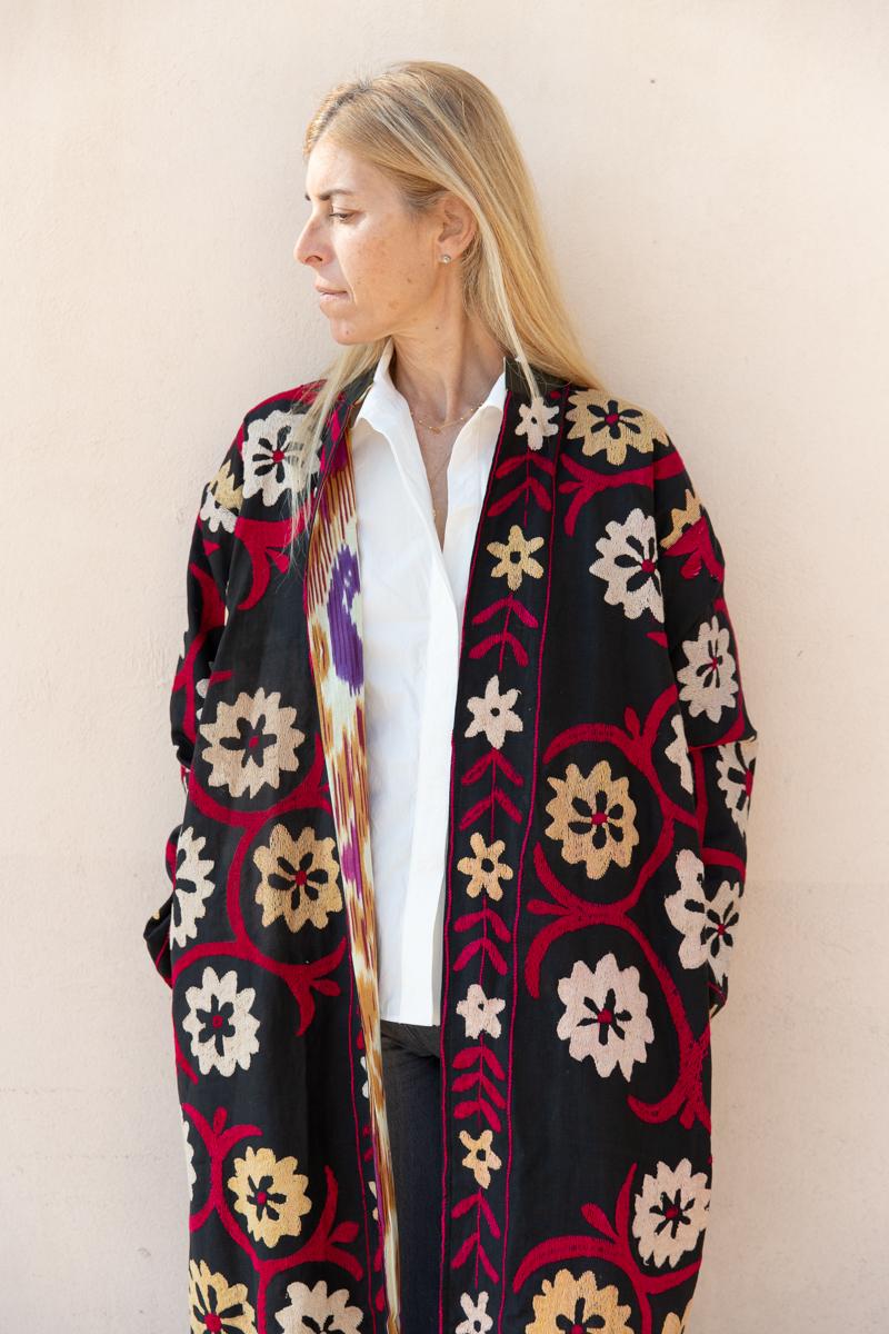Suzani de algodón largo, de color negro y bordado a mano. Vintage, con bolsillos y forrado de tela de algodón con estampado ikat.