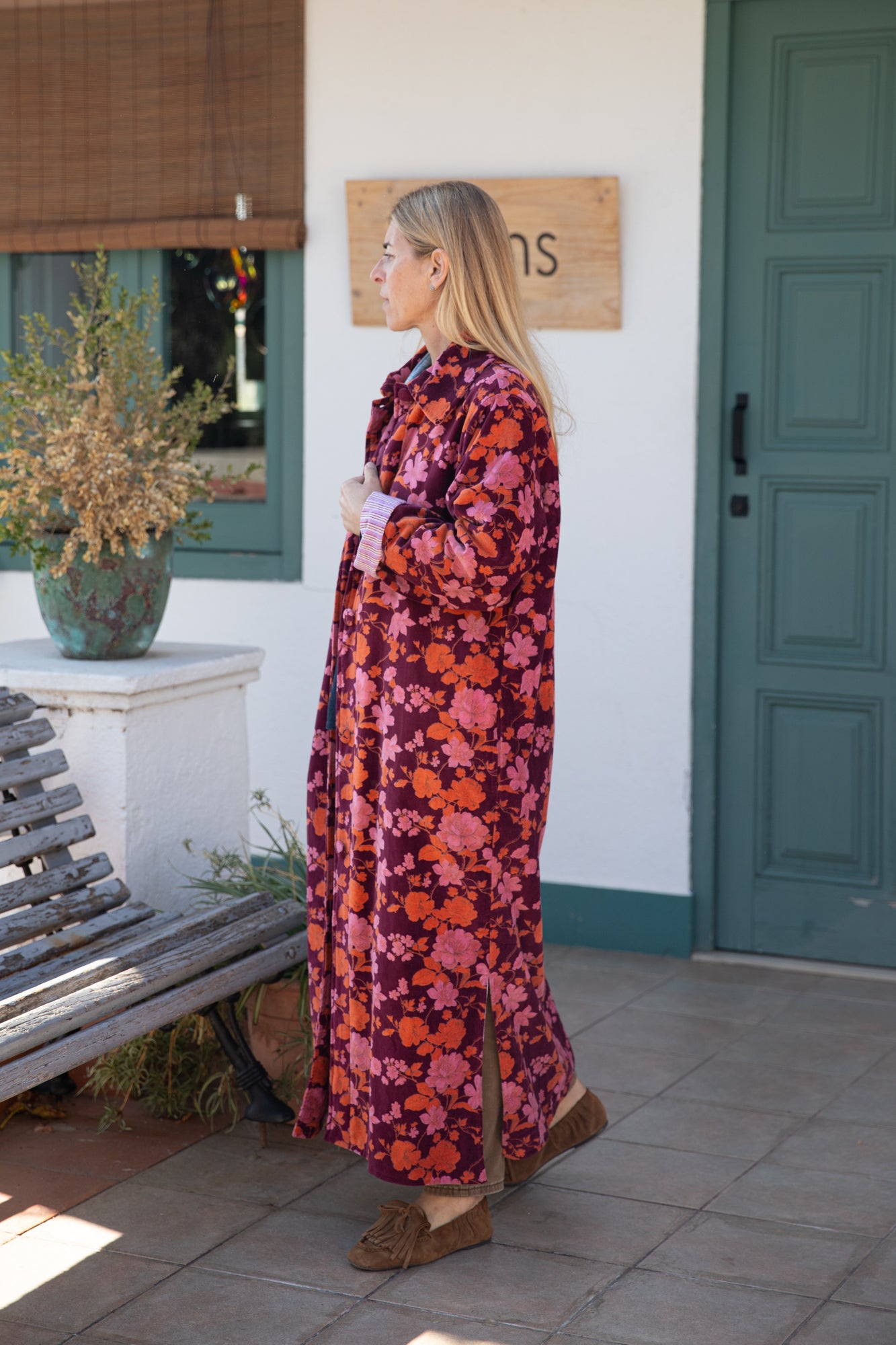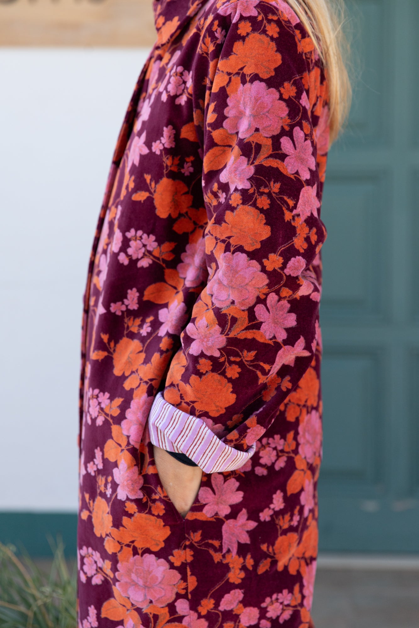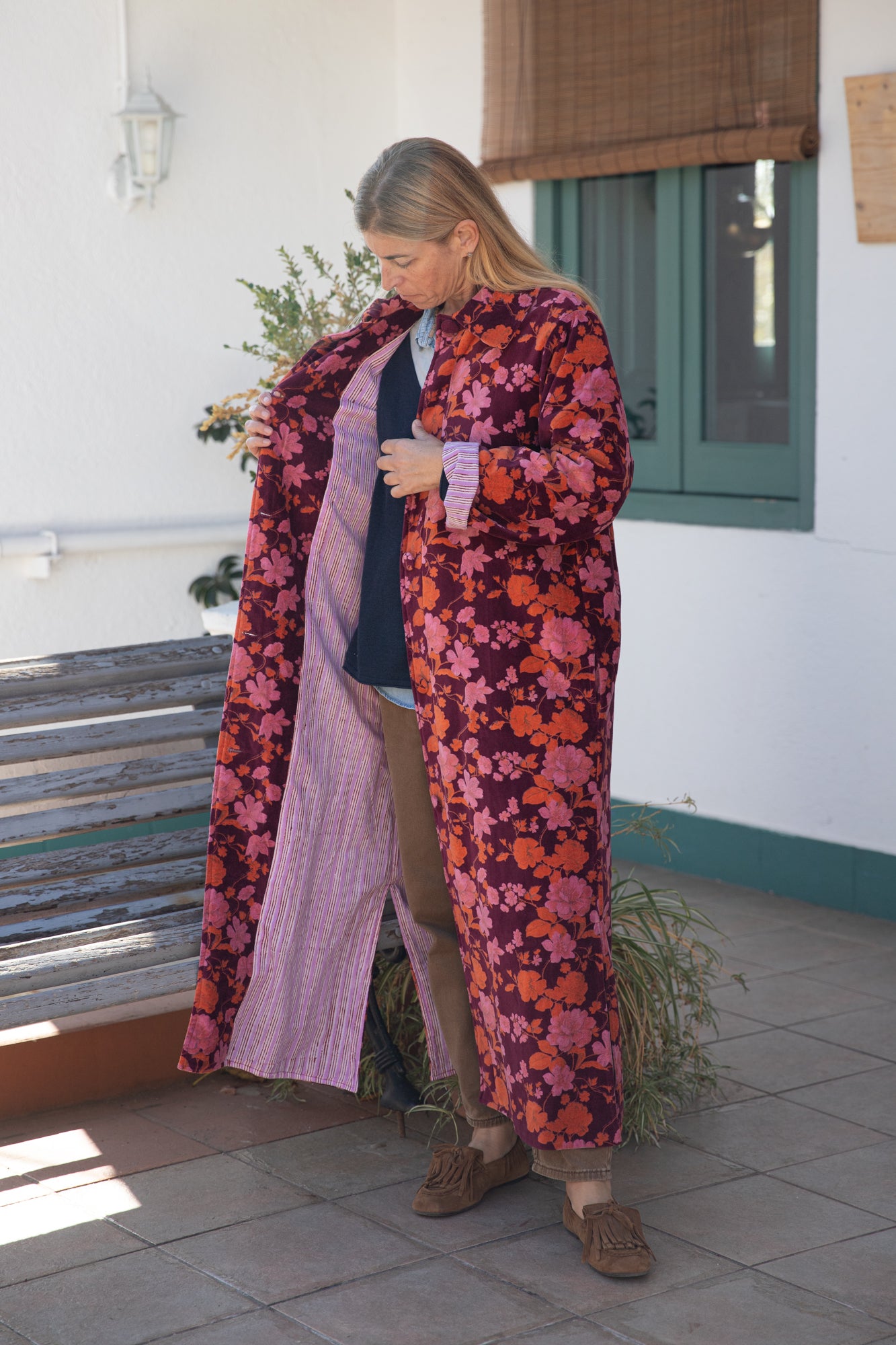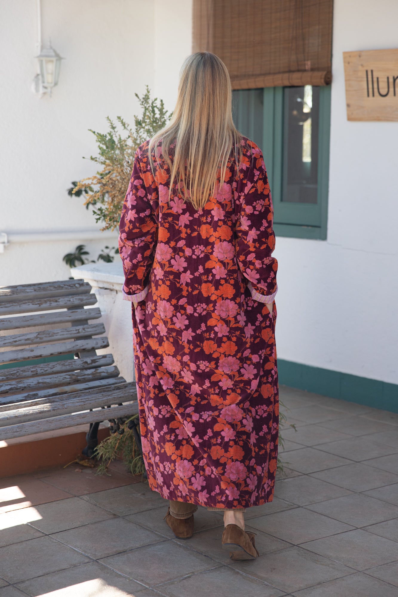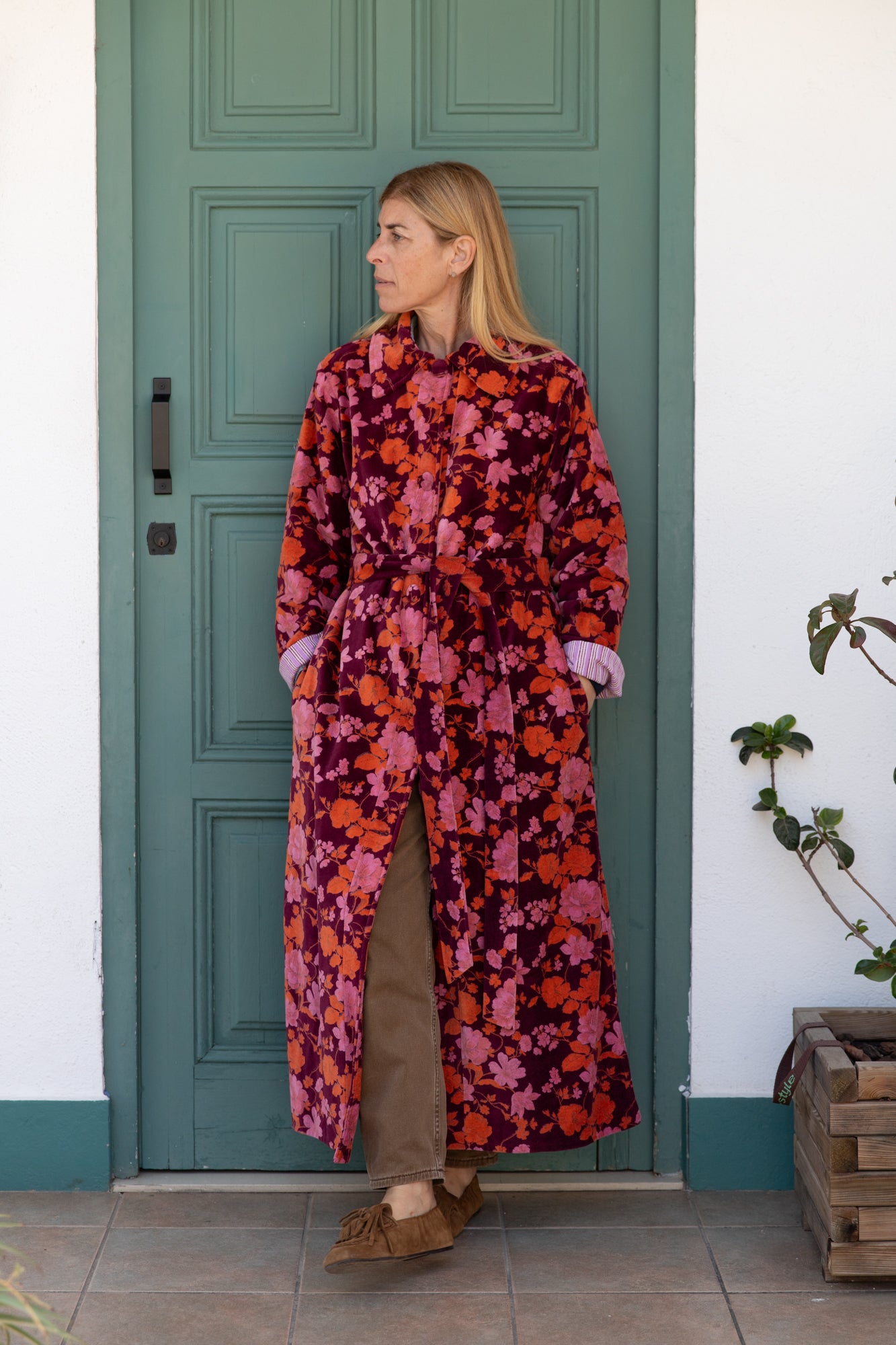 Chaqueta de terciopelo de algodón estampada, con forro de algodón a juego que crea un bonito contraste. Con cuello, cierre de botones, bolsillos laterales y cinturón. Talla única.