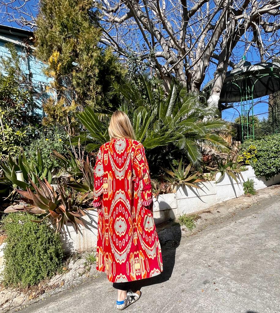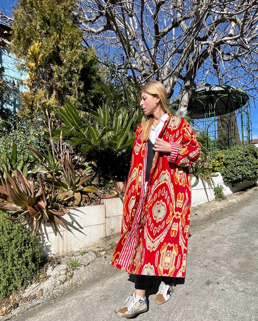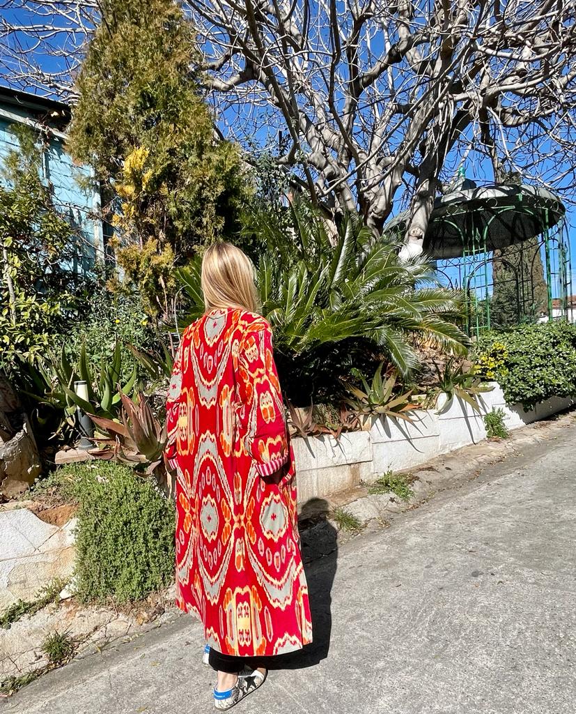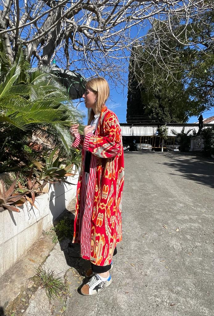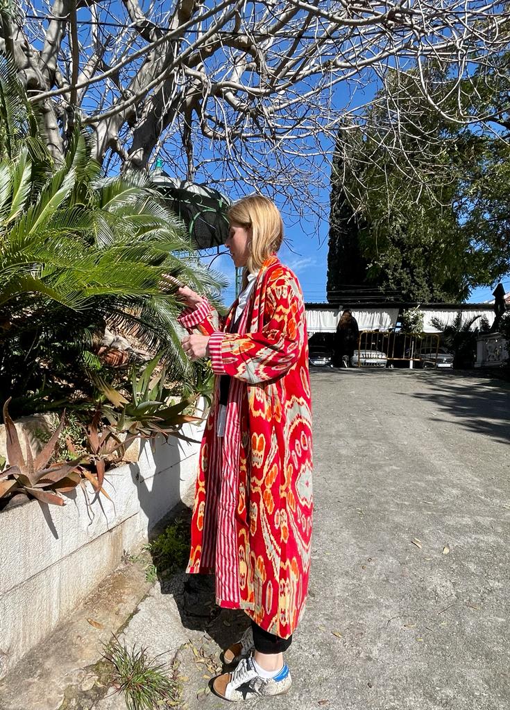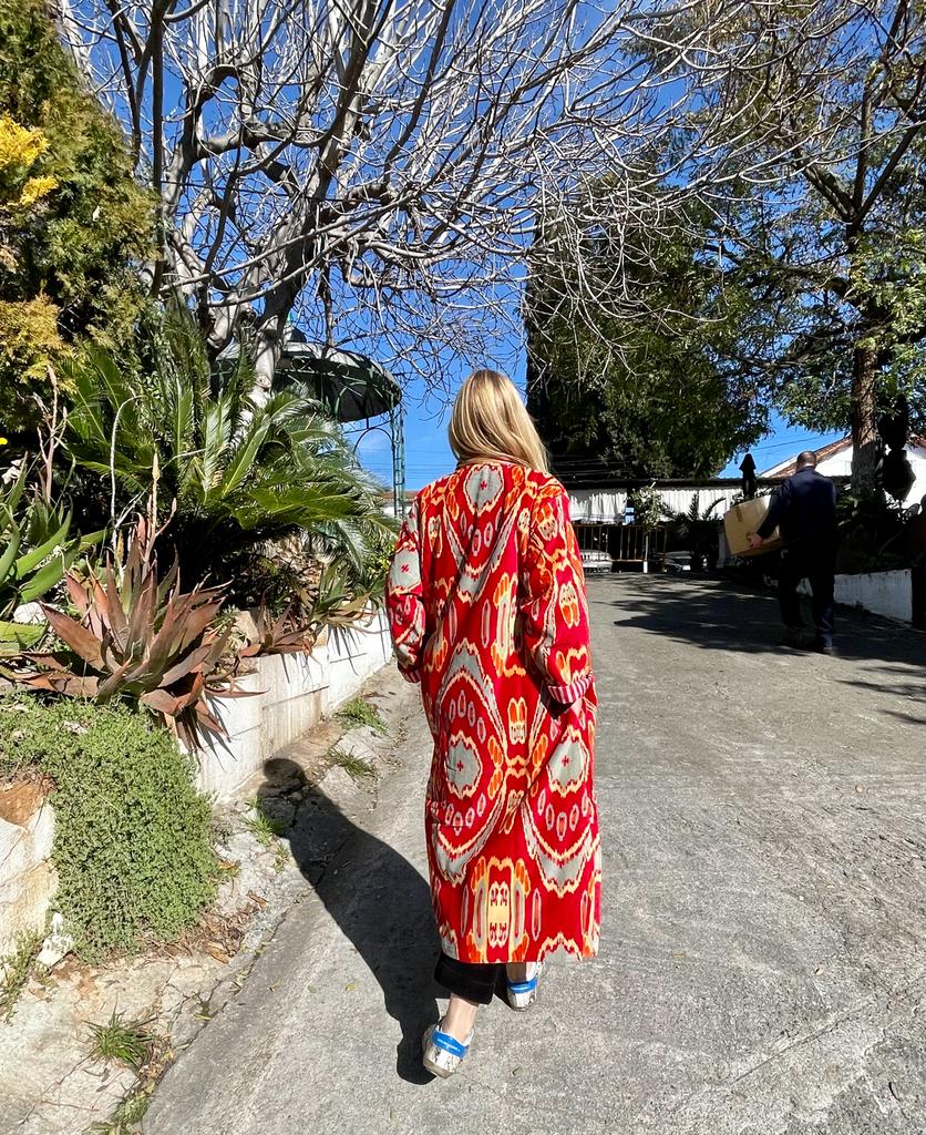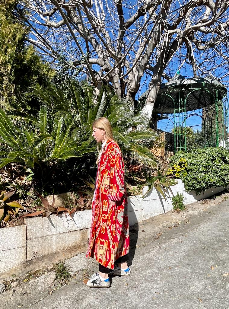 Abrigo largo de terciopelo. Bolsillos y Cinturón para lucir abierto o cerrado. Terciopelo con estampado floral.