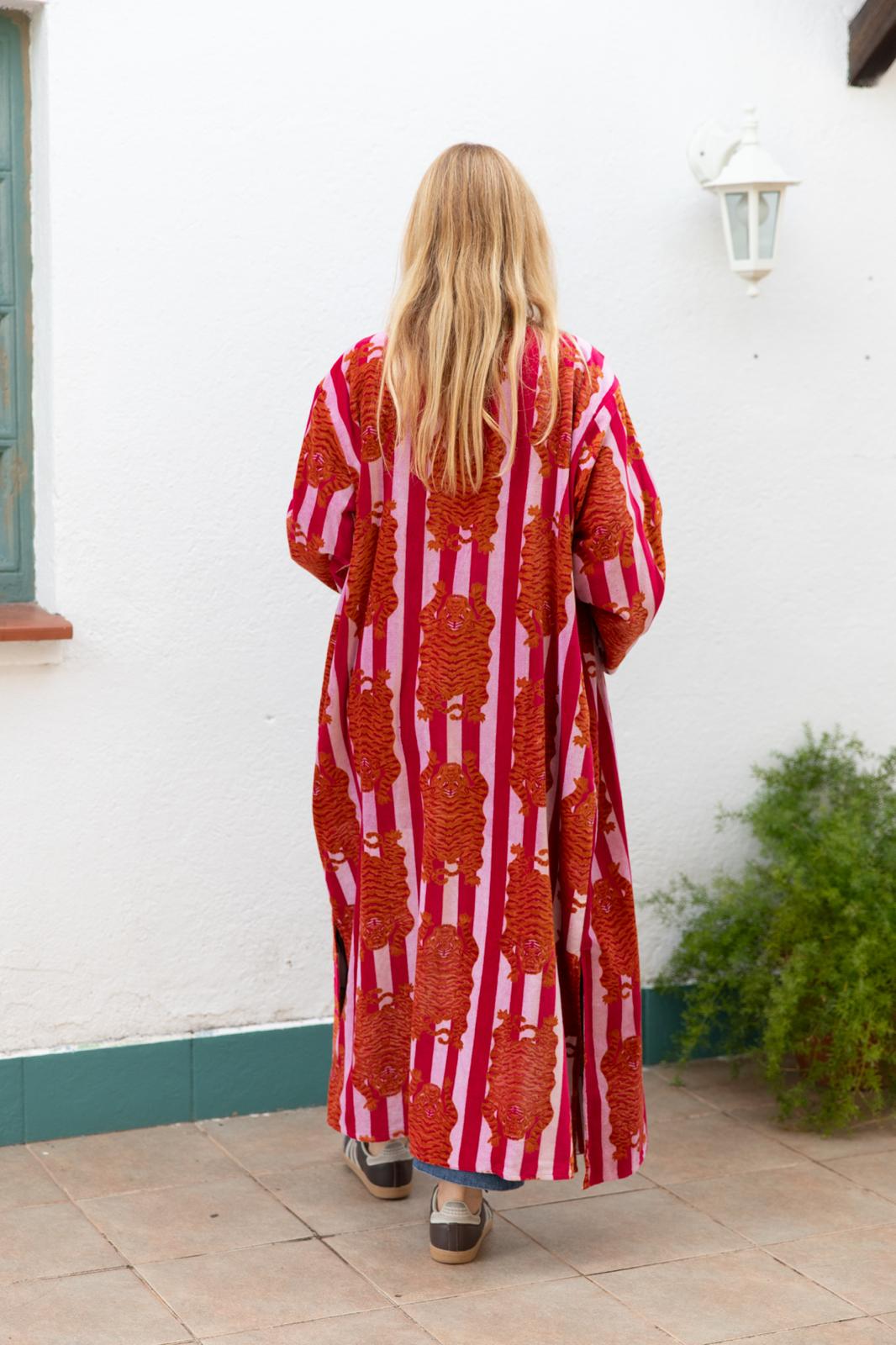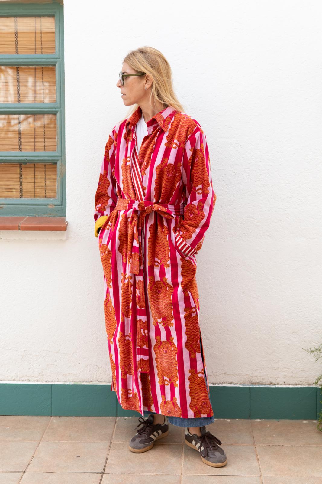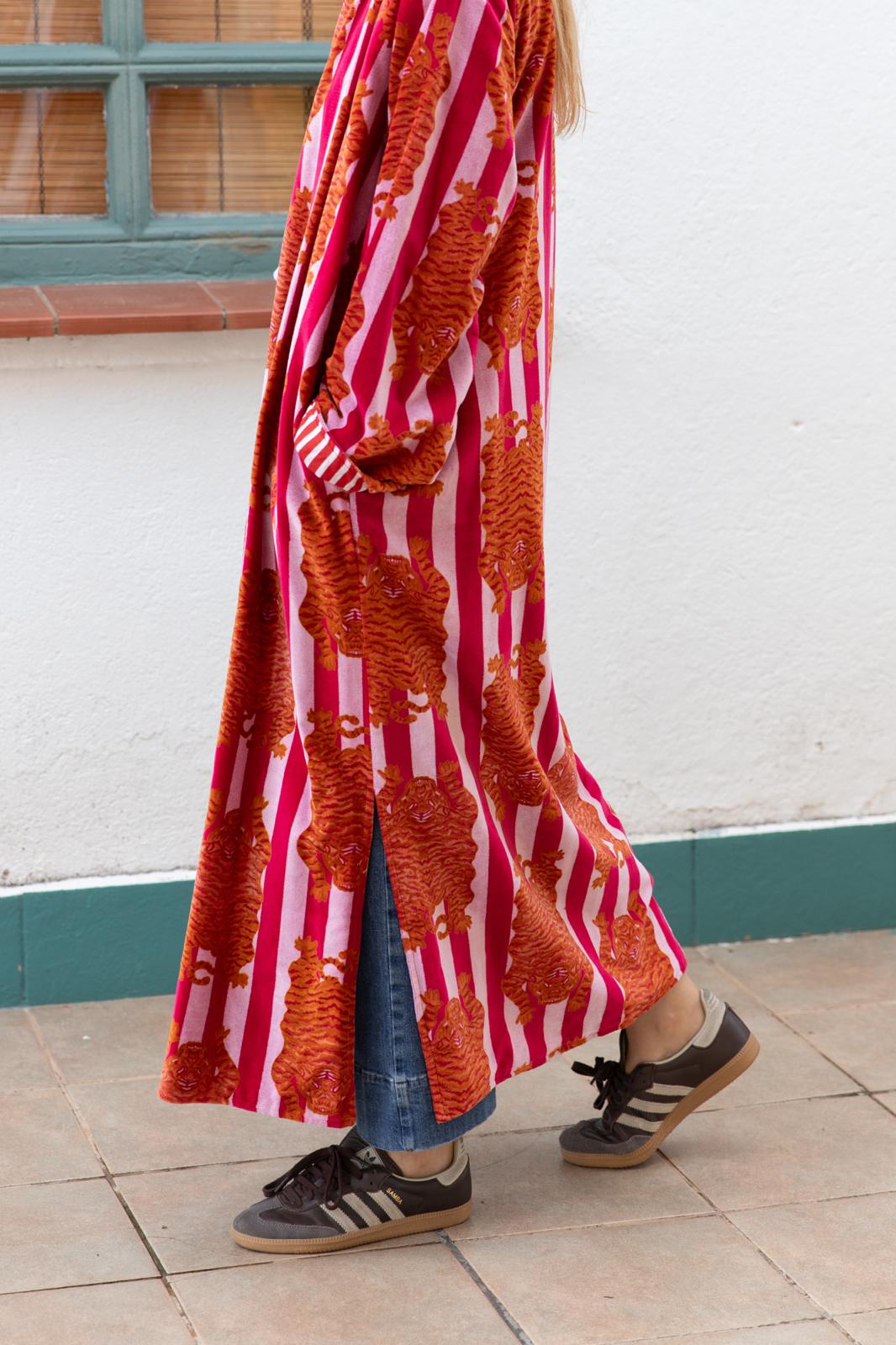 Chaqueta larga de terciopelo de algodón, con divertido estampado de rayas y tigres. Bolsillos laterales, forrada con tela de algodón estampada. Cuello camisero y cinturón.