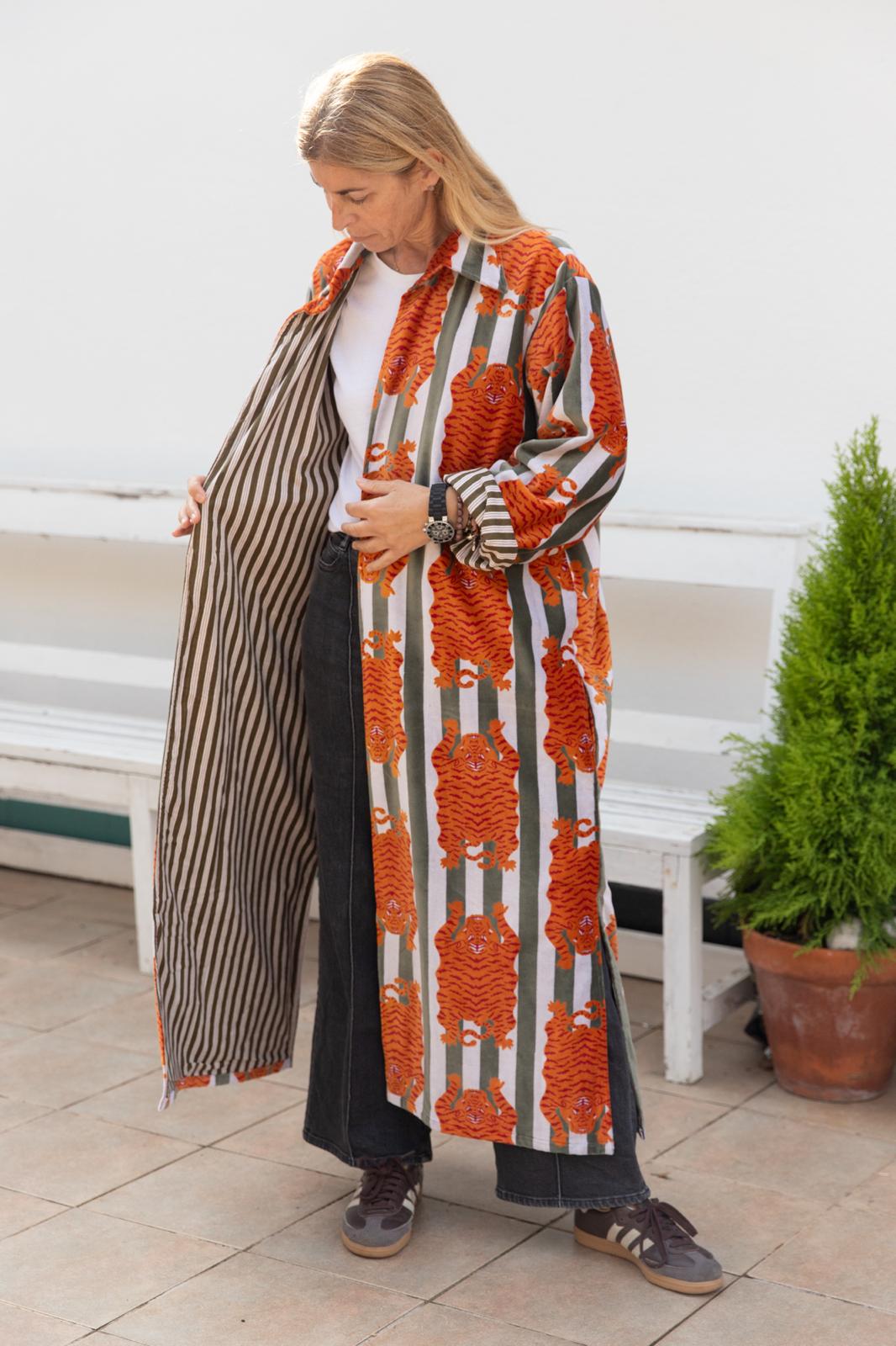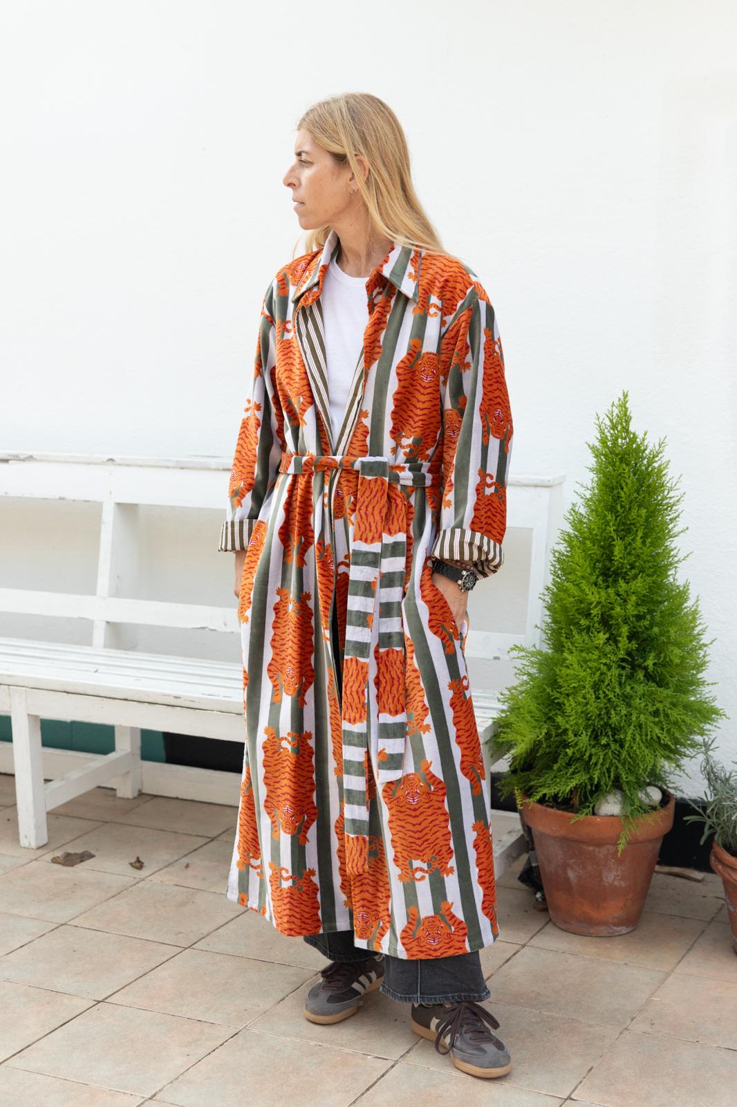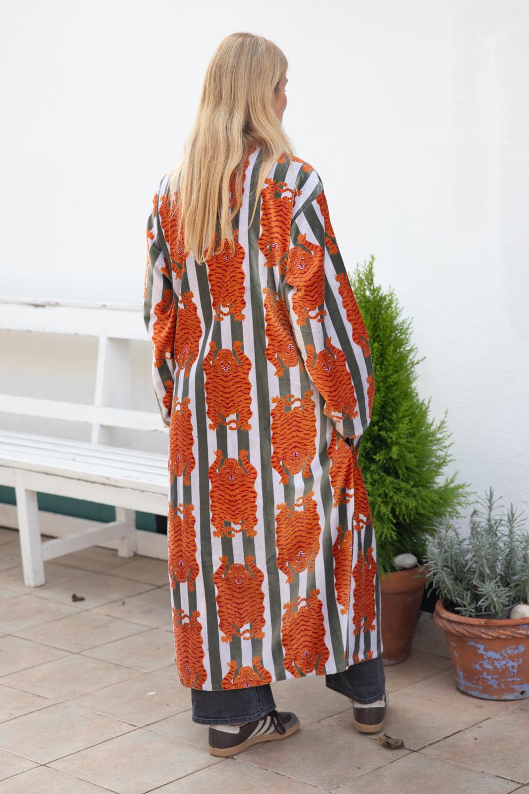 Chaqueta larga de terciopelo de algodón, con divertido estampado de rayas y tigres. Bolsillos laterales, forrada con tela de algodón estampada. Cuello camisero y cinturón.