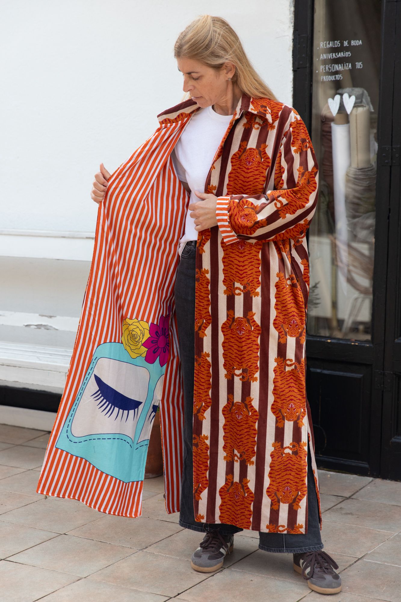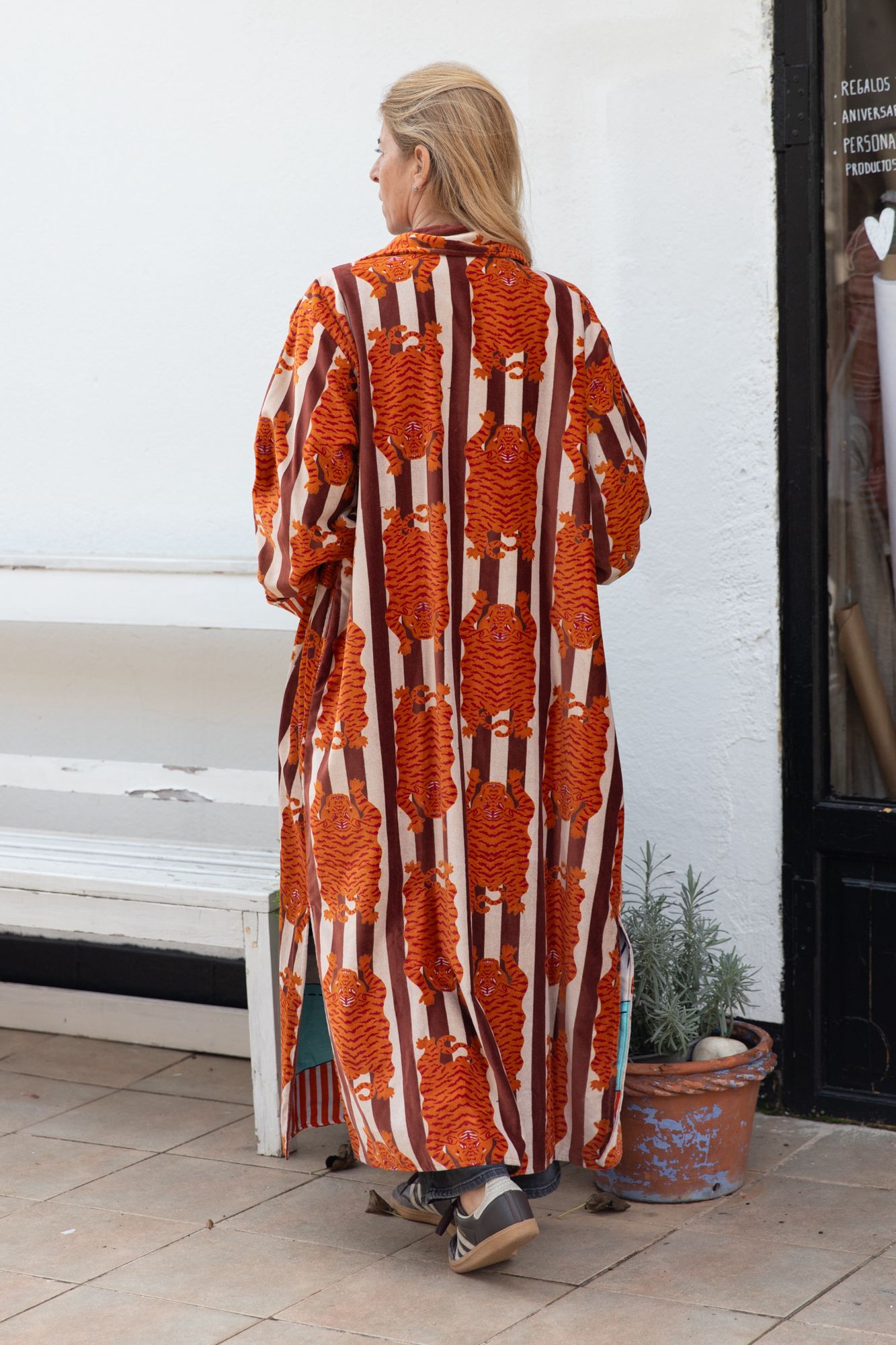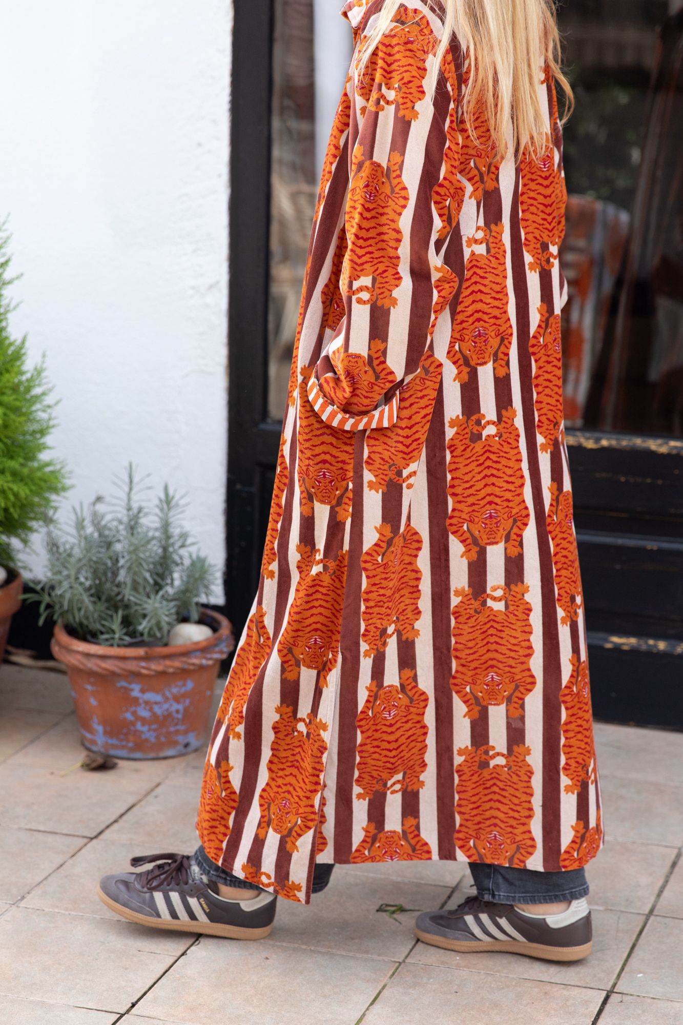 Chaqueta larga de terciopelo de algodón, con divertido estampado de rayas y tigres. Bolsillos laterales, forrada con tela de algodón estampada. Cuello camisero y cinturón.
