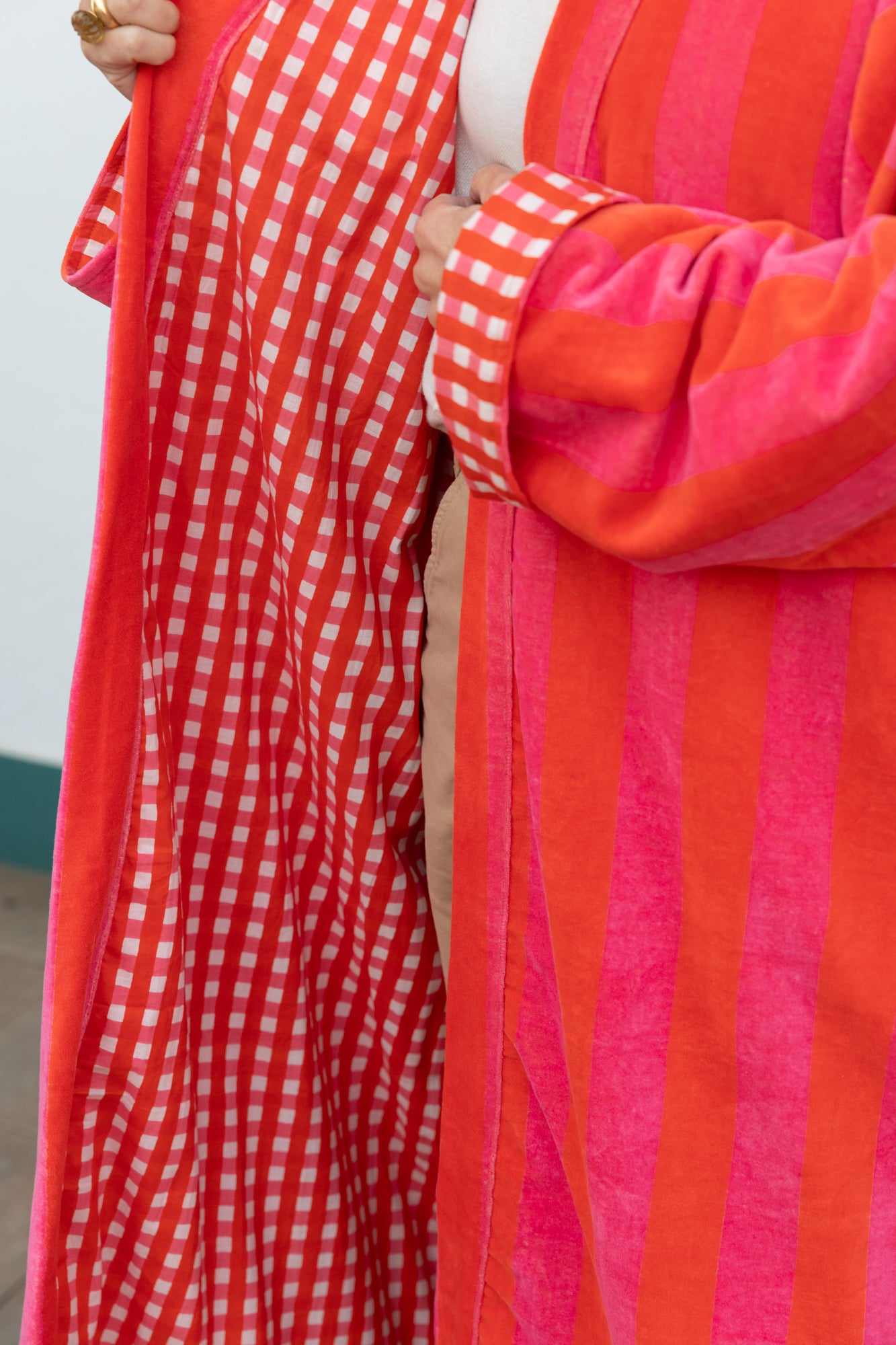 Chaqueta larga de terciopelo de algodón con diseño de rayas estampadas. Su diseño aporta personalidad y estilo, mientras que el forro interior de algodón crea un contraste bonito y cómodo para el uso diario. Cuenta con bolsillos prácticos y un cinturón que realza la silueta. Su talla única ofrece un ajuste cómodo y favorecedor.