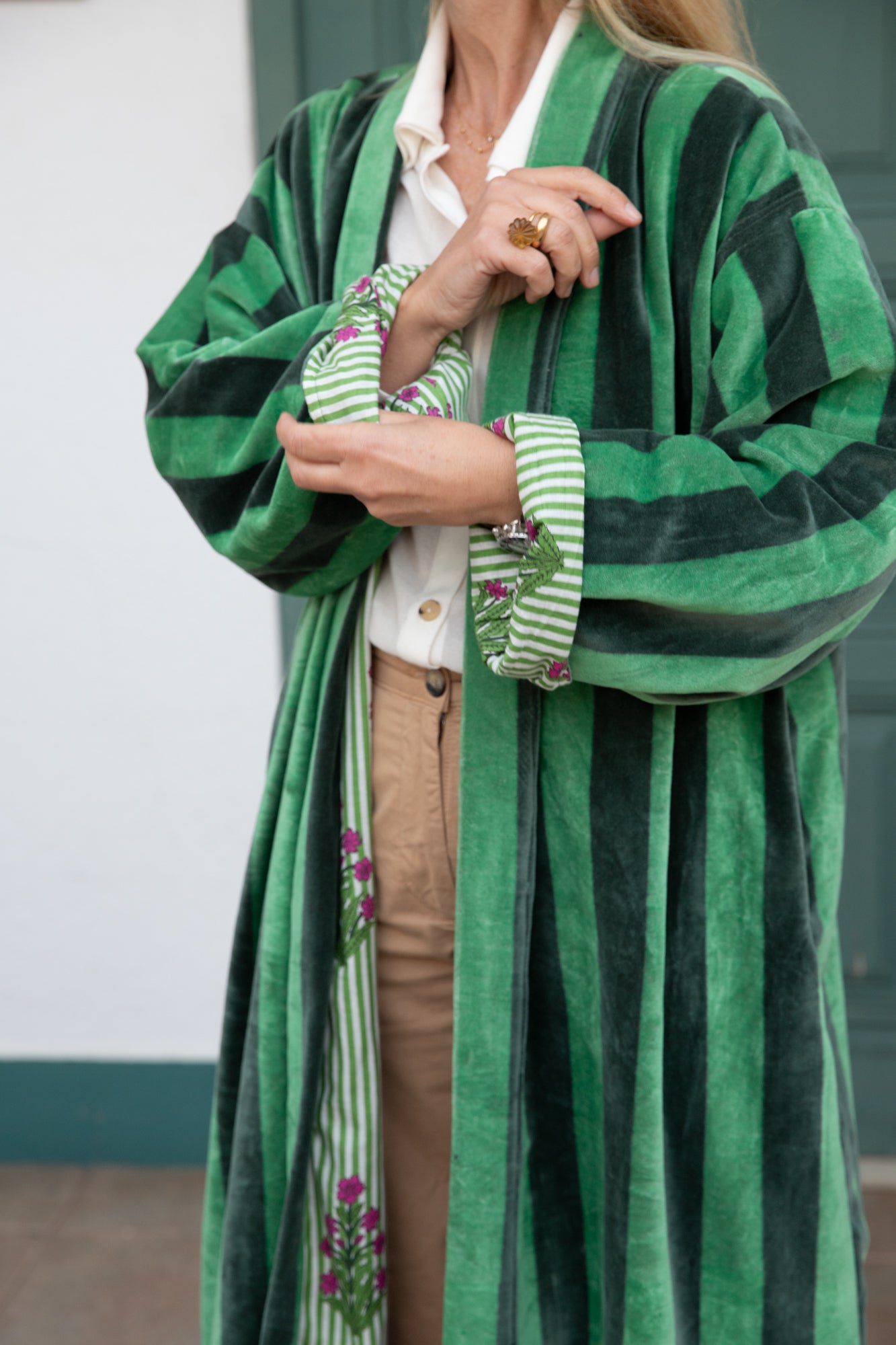 Chaqueta larga de terciopelo de algodón con diseño de rayas estampadas. Su diseño aporta personalidad y estilo, mientras que el forro interior de algodón crea un contraste bonito y cómodo para el uso diario. Cuenta con bolsillos prácticos y un cinturón que realza la silueta. Su talla única ofrece un ajuste cómodo y favorecedor.